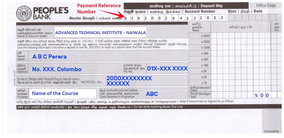 • Please use your given Payment Reference Number (079100194322032)(a number with 12 digits) as the Account Number and make sure to mention your Name , Address, Contact Number, NIC Number and Purpose (English and Computer Basic or AI Application) on the given space in the Deposit Slip.